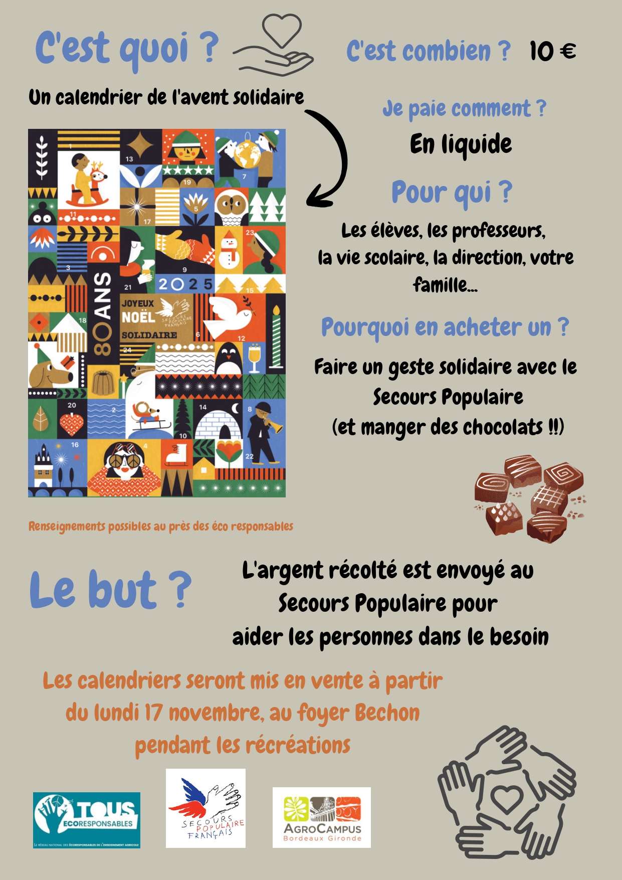 Calendrier de l’avent du Secours populaire Cette année, une élève écoresponsable a proposé de vendre des calendriers de l’avent du Secours Populaire, afin de soute